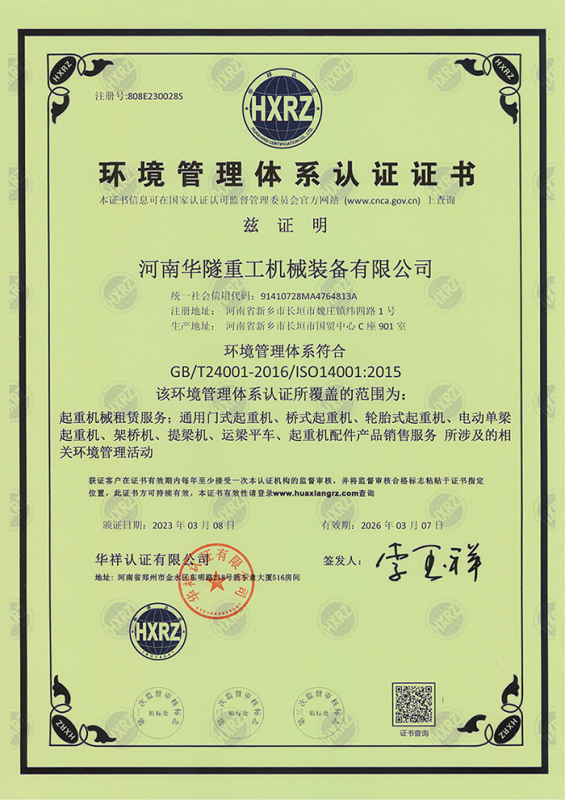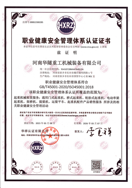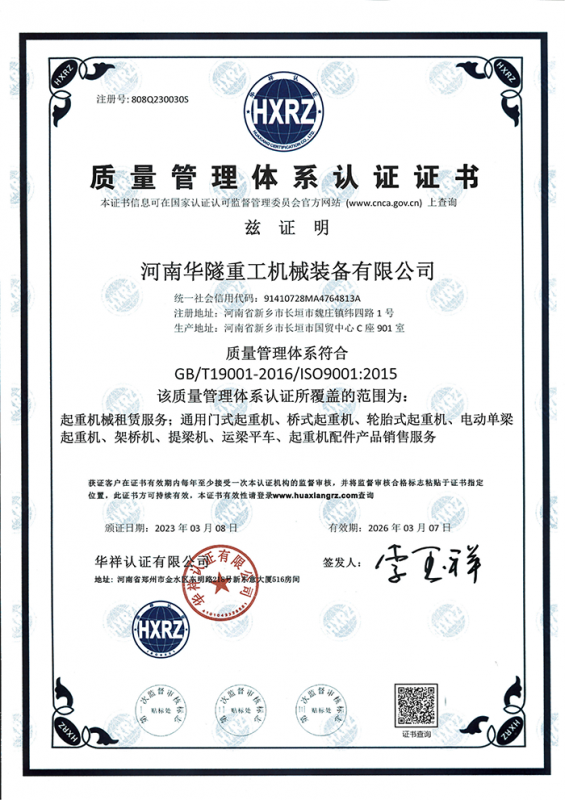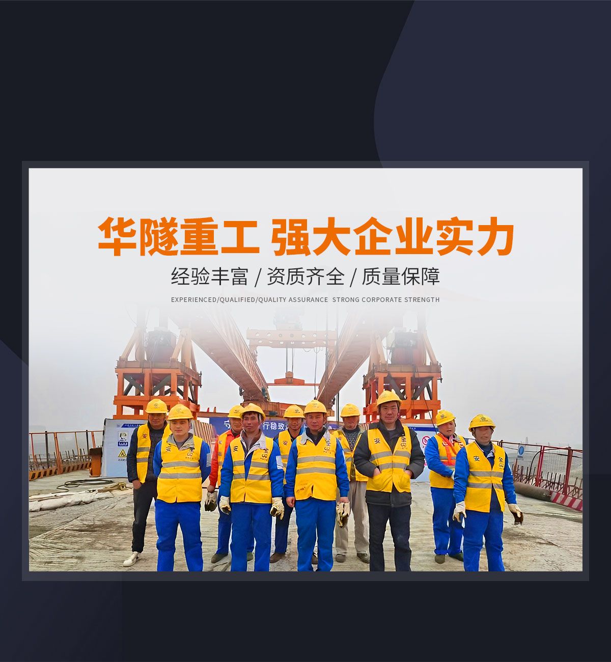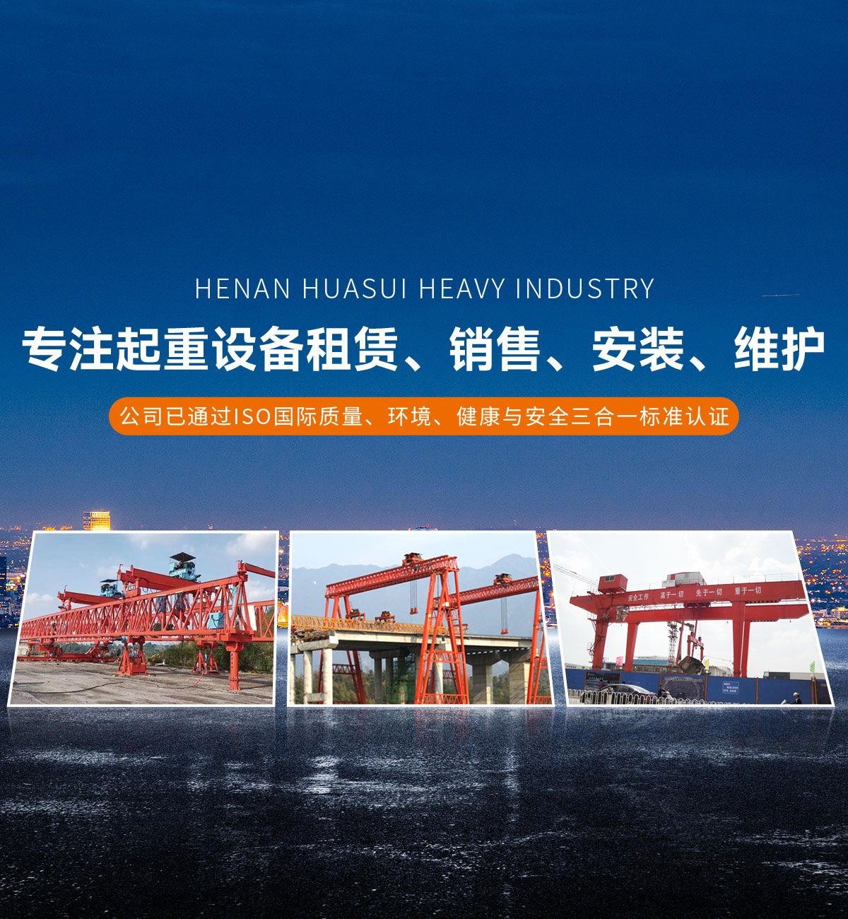 河南華隧重工機械裝備有限公司主要從事通用門式起重機、橋式起重機、電動單梁起重機,輪胎式起重機、架橋機、提梁機、遠梁平車、鋼絲繩電動萌蘆、卷揚機、起重配件制造、銷售:起重機械租賃、安裝和維修,起重設備園收,機械設備維修,鋼結構工程承包,橋梁工程及技術咨淘服務,銷售五金制品、機電設備:建設工程監理,建設工程設計,各類工程建設活動,建筑勞務分包,建筑物折除作業,施工作業,工程管理服務,土石方工程施工,裝如發運。  公司已通過IS0國際質量、環境、健康與安全三合一標準認證,特種設備制造許可證和特種設備安裝改造維修許可證。擁有完熟的質量管理體系。嚴格的管理制度,強大的生產能力和先進的檢測手段,在保證產品質量的同時,也具備了極強的市場競爭力?! 」緢猿挚萍紕撔聻槔砟睿a品質量為核心,注重信譽,建立了減信可靠、快捷、思速。便利周到的售后服務網絡。  我們擁有的技術專家和技術服務隊伍為客戶提供充善的售前技術支持和全天候的售后服務體系,讓您無后顧之憂,享受一站式的超值服務。  “華隧重工,伴您成功“是華隧重工永遠的宗指,真被的希望與各界朋友攜手并進。共創輝準!